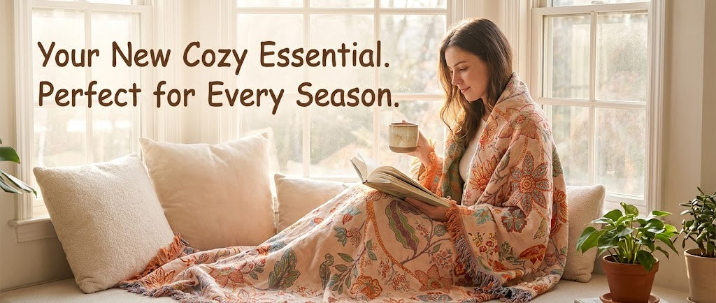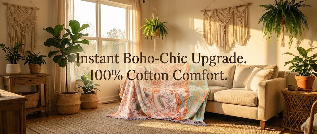 The Primevory™ Rustic Floral Tassel Throw| 100% Breathable Cotton | Boho Vintage Style